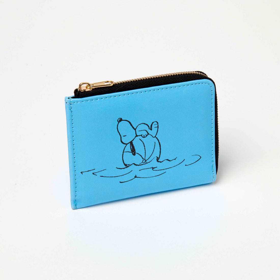 Screen-printed vegan pleather. Featuring Snoopy lying on a beach ball in the sea on the front...